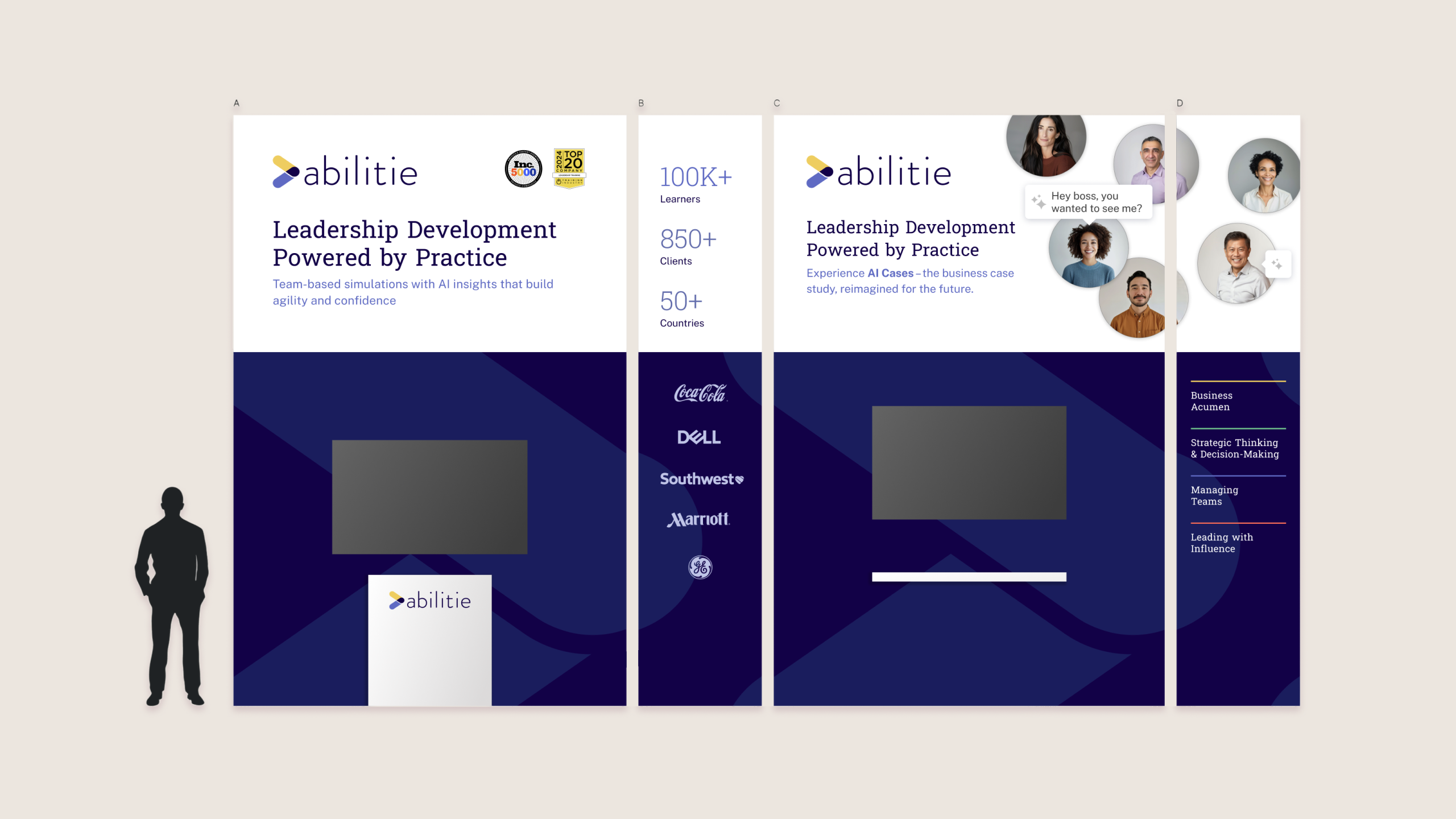 For the conference booth, I designed a main tower display and supporting assets that drew attention, guided visitor focus, and told the story of Abilitie’s leadership development programs. Insights from the 12-Week MBA course helped me anticipate how attendees might engage with materials and identify opportunities for clearer messaging and visual hierarchy. This approach ensured that design decisions supported both brand consistency and marketing effectiveness.